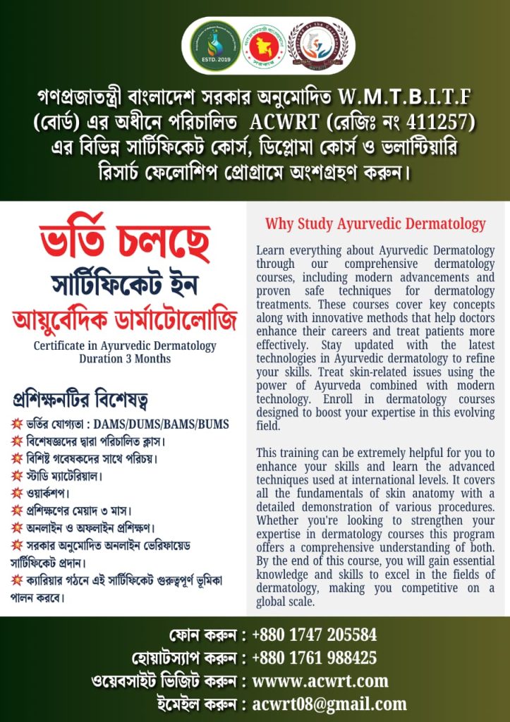 Certificate in Ayurvedic Dermatology Certificate in Ayurvedic Dermatology Eligibility : DAMS/DUMS/BAMS/BUMSFees : ৳ 9,500 with 2 installmentsClass Mode :1) Offline / Online 2) 15 ClassesSyllabus :1. Understand skin diseases by Ayurveda2. Diagnostic method3. Herbal remedies 4. Ayurvedic therapies5. Diet & lifestyle 6. Emergency management