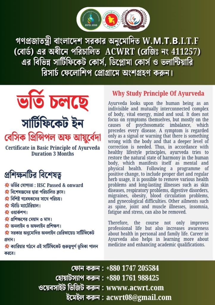 Certificate in Basic Principle of Ayurveda Certificate in Basic Principle of Ayurveda Eligibility : HSC passedFees : ৳ 9,500 with 2 installmentsClass Mode :1) Offline / Online 2) 15 ClassesSyllabus :1. The definition of Ayurveda, its unique features, and its aim2. Pancha Mahabhuta3. Tridosha4. Prakruti5. Sapta Dhatu6. Mala7. Srotas8. Agni9. Koshta10. Ama