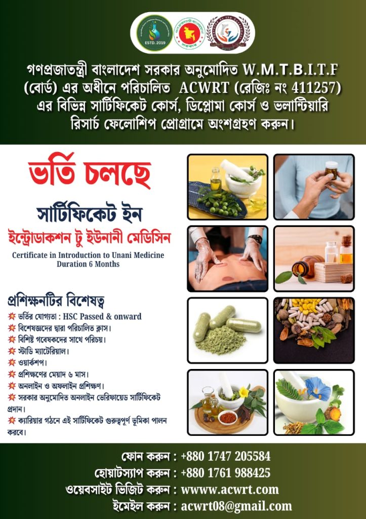 Certificate in Introduction to Unani Medicine Certificate in Introduction to Unani Medicine Eligiblity : HSC passed & onwardFees : ৳ 12,500 with 3 installments