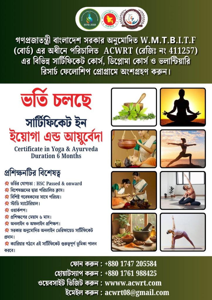 Certificate in Yoga & Ayurveda Certificate in Yoga & Ayurveda Eligiblity : HSC passed & onwardFees : ৳ 12,500 with 3 installments